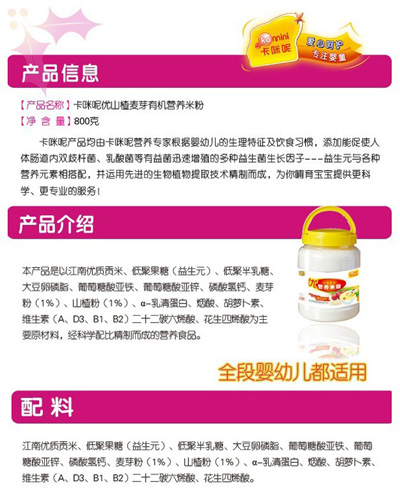 卡咪呢有機(jī)米粉系列是專(zhuān)為中國(guó)寶寶設(shè)計(jì)的營(yíng)養(yǎng)輔食,選用有機(jī)大米,科學(xué)搭配維生素AD等維生素,還特別添加;撬、DHA、AA等有助智力發(fā)育的營(yíng)養(yǎng)成分,富含15種營(yíng)養(yǎng)素,F(xiàn)上?ㄟ淠啬笅胗闷酚邢薰久嫦蛉珖(guó)空白市場(chǎng)區(qū)域誠(chéng)招卡咪呢有機(jī)米粉代理商。