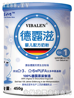 德露滋為德國制造的奶粉,在德國同步銷售的商標為VIBALEN,盒裝。在亞洲華語地區(qū)為VIBALEN德露滋,聽裝。